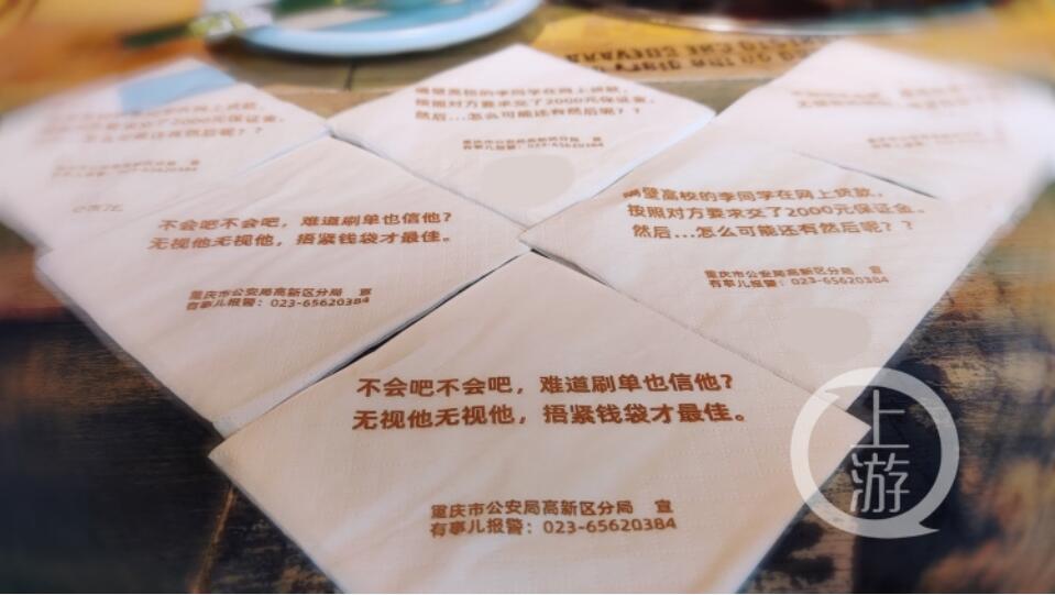 當(dāng)?shù)谝淮文玫竭@種特殊餐巾紙時,西部科學(xué)城重慶高新區(qū)公安分局虎溪派出所民警崔成玉感到又驚又喜:“公安的反詐宣傳工作,最希望能發(fā)動群眾力量。這樣的創(chuàng)意正是我們想看到和所需要的!