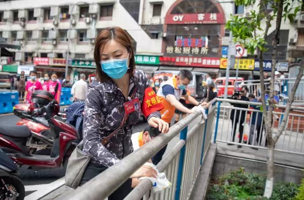 志愿者對圍欄進行清潔。楊家坪街道供圖