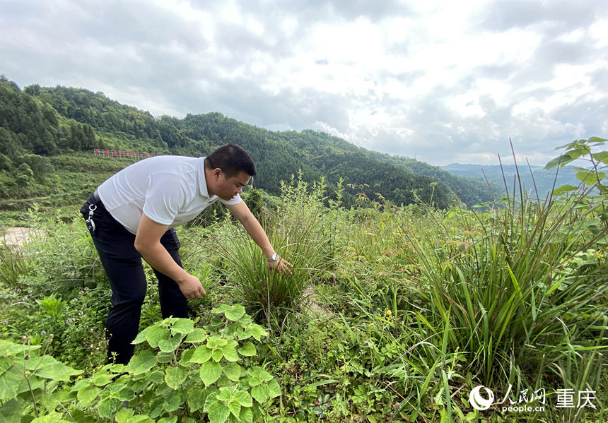 余思成在查看香根草長勢。人民網(wǎng) 劉政寧攝