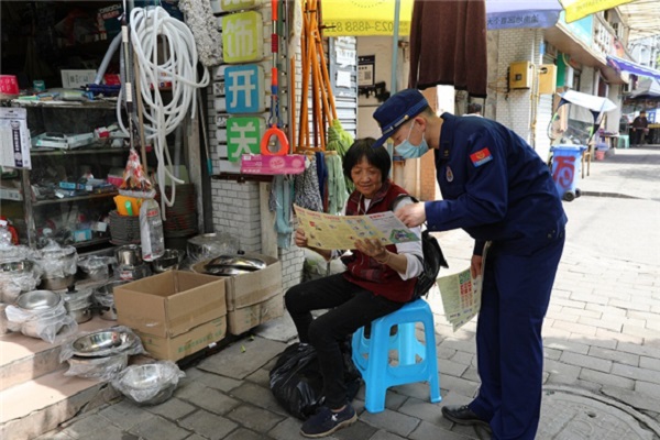 活動現(xiàn)場,該大隊(duì)宣傳人員進(jìn)入商鋪并向過路群眾發(fā)放消防安全知識宣傳資料,向他們講解發(fā)生火災(zāi)如何正確逃生自救、如何撥打110火警電話報(bào)警以及滅火器的使用方法等消防知識。