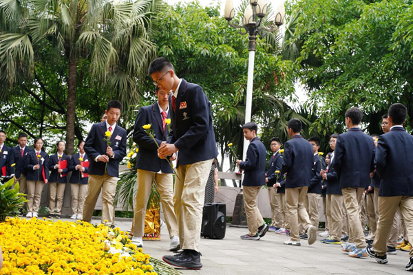 學(xué)生紛紛為烈士銅像敬獻(xiàn)鮮花。重慶八中宏帆中學(xué)供圖