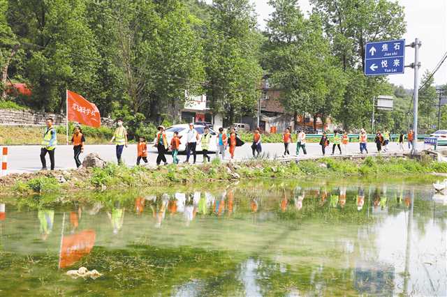 “五一”假期,忠縣布澤學(xué)校伏羲班組織小學(xué)生親子徒步研學(xué)隊(duì),步行108公里從忠縣經(jīng)豐都前往涪陵816核工業(yè)基地參觀采訪。圖為孩子們?cè)谕讲街。通訊員 曾素芳 馮曉鋒 攝影報(bào)道/視覺(jué)重慶