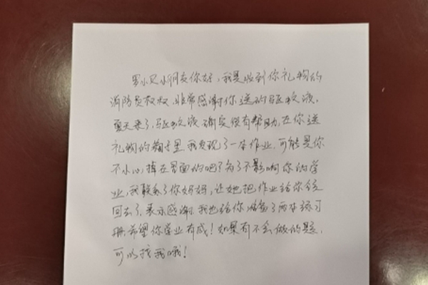 最終,5月4日,“五一”假期最后一天,小女孩的媽媽來到百安壩消防救援站取回了女兒的練習冊,并帶回了消防員精心準備的回贈禮物--另外兩本練習冊和一封手寫的感謝信。