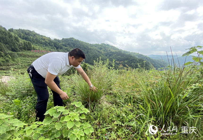 余思成在查看香根草長勢。人民網(wǎng) 劉政寧攝