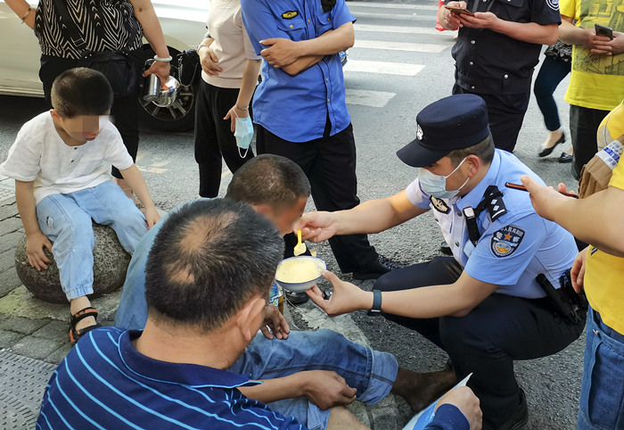 男子餓暈在街頭 民警蹲下一勺一勺喂食