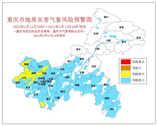 5月13日16時(shí),重慶市規(guī)劃和自然資源局、重慶市氣象局聯(lián)合發(fā)布全市地質(zhì)災(zāi)害氣象風(fēng)險(xiǎn)預(yù)警。