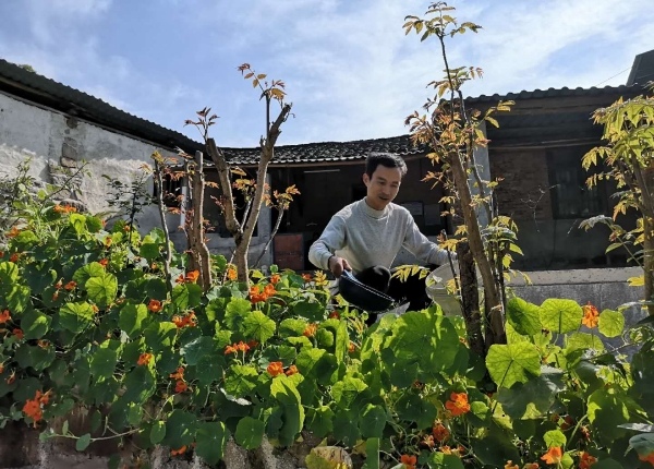 鐘灣村村民張國(guó)強(qiáng)精心管護(hù)自家花園。朱琳攝