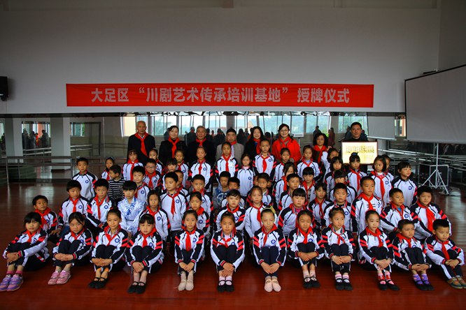 藝術節(jié)期間,肖德美為雍溪鎮(zhèn)實驗學校授予“國家級非物質文化遺產川劇代表性傳承人肖德美傳習基地”的牌匾,圍繞雍溪鎮(zhèn)實驗學校開展川劇的相關傳承教學。到今天,川劇已經成功走進了大足區(qū)城南創(chuàng)新小學、萬古鎮(zhèn)中心幼兒園等近10所學校。