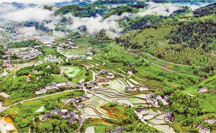 5月16日,萬盛經(jīng)開區(qū)叢林菌谷蘑菇游樂園,晨霧繚繞,梯田與民居掩映在青山綠野中。