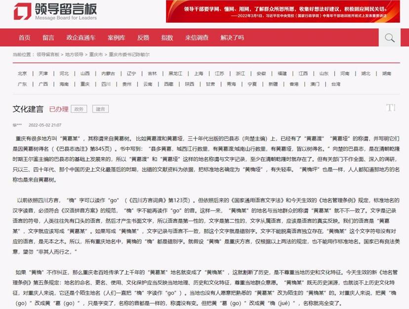人民建議|地名有錯建議改 重慶市民政局:今后命名中統(tǒng)一