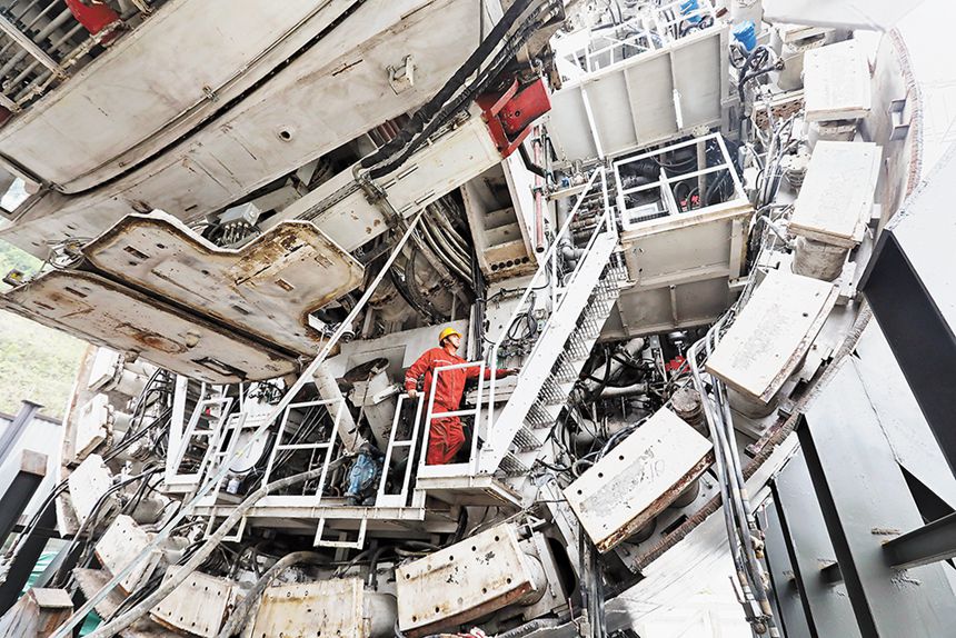 5月24日,中鐵十四局的技術(shù)人員正在進(jìn)行盾構(gòu)機(jī)的調(diào)試工作。該盾構(gòu)機(jī)長146米,重4200噸,屬于盾構(gòu)機(jī)中的“巨無霸”,調(diào)試完成后將投入渝湘高鐵長江隧道掘進(jìn)施工。