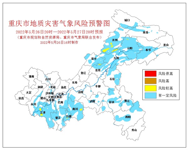 5月26日16時(shí),重慶市規(guī)劃和自然資源局、重慶市氣象局聯(lián)合發(fā)布全市地質(zhì)災(zāi)害氣象風(fēng)險(xiǎn)預(yù)警。