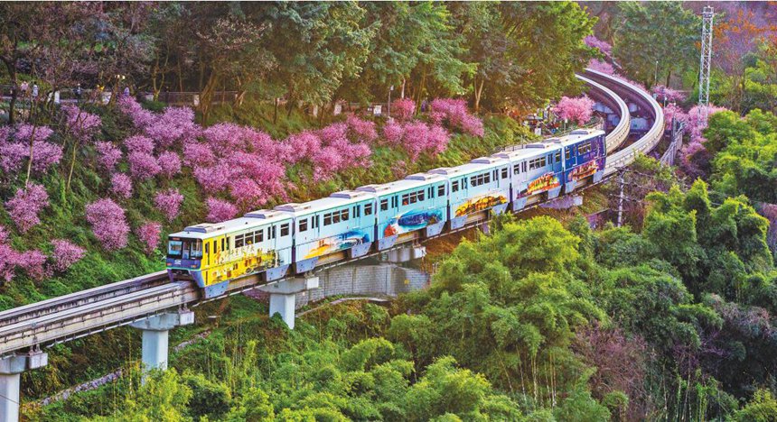 二月二十三日,軌道交通二號(hào)線渝中區(qū)佛圖關(guān)段,軌道列車穿行在花海中,成為一道亮麗的風(fēng)景線。特約攝影 王正坤\視覺(jué)重慶