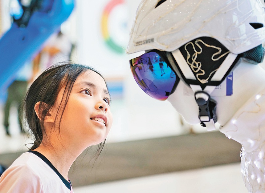 重慶國(guó)博中心,一名小姑娘好奇地打量智博會(huì)上重慶館展示的石墨烯穿戴設(shè)備。(攝于二〇一九年八月二十五日)記者 崔力 攝\視覺(jué)重慶