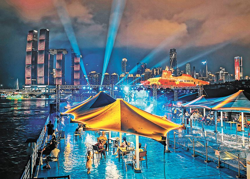 長(zhǎng)江“黃金六號(hào)”游輪上,游客在甲板上“逛街”賞山城夜景。(攝于二〇二〇年七月二十五日)記者 崔力 攝\視覺(jué)重慶