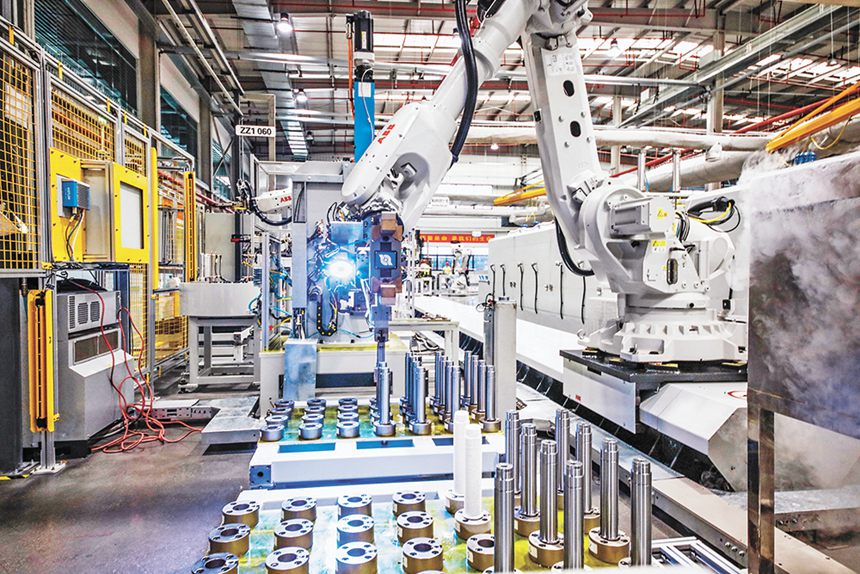 沙坪壩區(qū)青鳳高科產(chǎn)業(yè)園區(qū)賽力斯鳳凰智慧工廠,生產(chǎn)線上的機(jī)器人正在作業(yè)。(攝于2021年8月)特約攝影 王正坤/視覺(jué)重慶