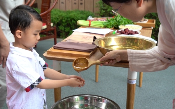 束脩六禮是古代學子入學拜師時,用肉干、芹菜、龍眼干、蓮子、紅棗、紅豆等六種具有象征意義的禮物,表達尊師孝親寓意的禮儀。在莊重的習禮、凈儀、拜請老師、敬奉六禮、正衣冠、四拜禮、誦讀經典、感恩父母等儀程中,學童代表激勵自己在學習生活中踐行傳統(tǒng)智慧,銘記國家民族使命,勿忘世家傳承,讓人動容。
