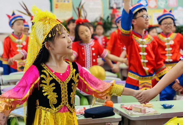 講臺上,老師們結(jié)合圖片視頻繪聲繪色地給學(xué)生們講解著各民族的特色和習(xí)俗,校園里的孩子們也穿著色彩斑斕、風(fēng)格各異的民族服飾暢游在校園的各個角落,參加民族知識競賽、民族才藝展示、班級游園、勞動比賽、課本劇表演等。