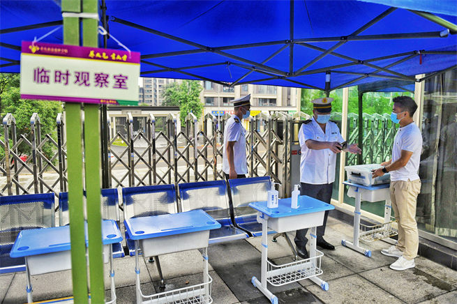 6月2日,聯合執(zhí)法組的隊員正在對考點的疫情防控設施進行檢查。崔力攝