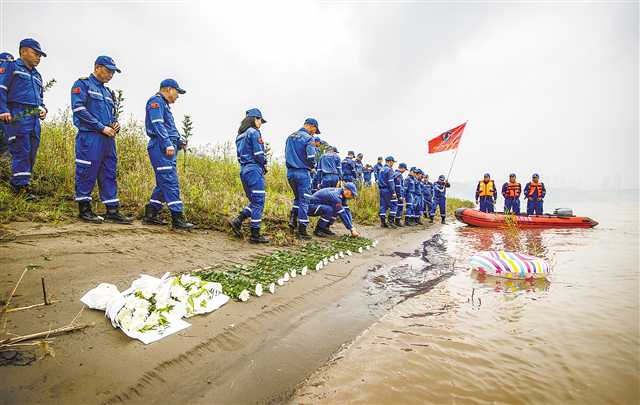 6月1日,大渡口區(qū)茄子溪萬(wàn)發(fā)碼頭江邊,隊(duì)員們用鮮花悼念英雄王紅旭老師。