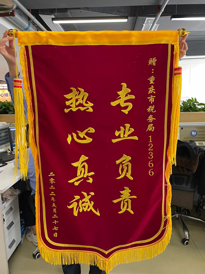 2022年5月30日,重慶市民陳女士將一面繡有“專業(yè)負責 熱心真誠”的錦旗送到12366納稅繳費服務熱線,對熱線工作人員向和平的服務表示感謝。