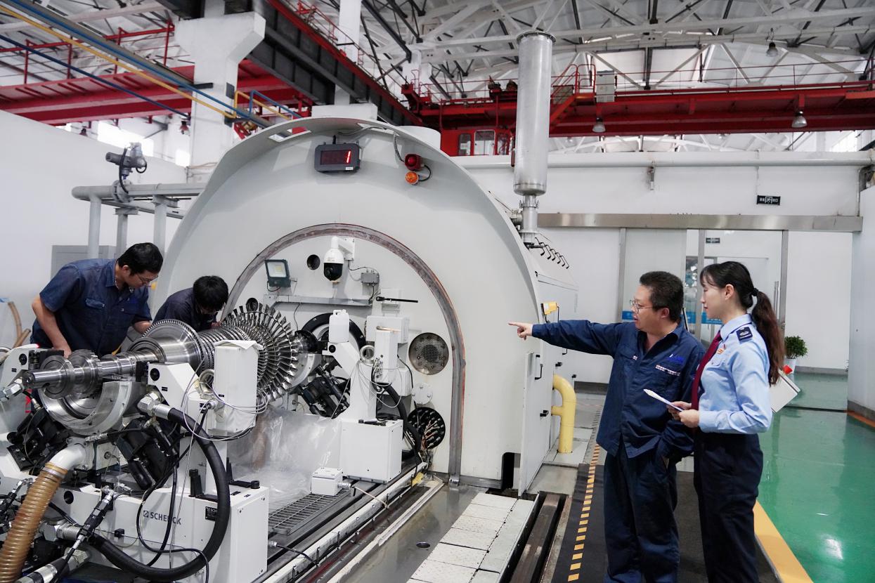 重通透平技術(shù)股份有限公司工作人員向重慶經(jīng)開(kāi)區(qū)稅務(wù)人員介紹高速旋轉(zhuǎn)部件質(zhì)量檢測(cè)與超速試驗(yàn)系統(tǒng)運(yùn)轉(zhuǎn)情況。 歐陽(yáng)蕾攝