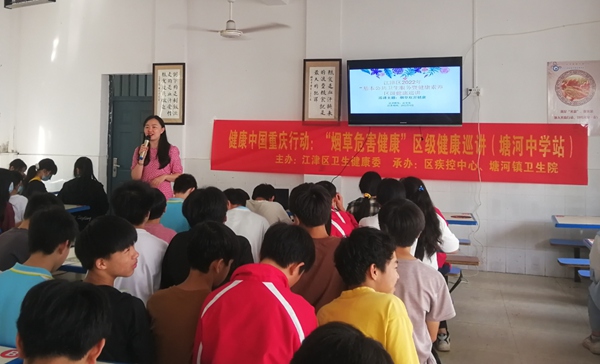 “煙草煙霧中含有主要的有害成分包括至少多少種已知的致癌物呢?”“二手煙、三手煙對(duì)健康的危害有哪些呢?”。為深入推進(jìn)“我為群眾辦實(shí)事”實(shí)踐活動(dòng),6月14日,江津區(qū)疾控中心黨總支聯(lián)合塘河鎮(zhèn)衛(wèi)生院走進(jìn)塘河中學(xué),為210余名學(xué)生開展“煙草危害健康”為主題的講座。