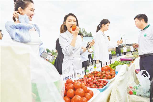 在潼南區(qū)太安鎮(zhèn)罐壩村的成渝地區(qū)雙城經(jīng)濟(jì)圈農(nóng)業(yè)科技成果展示基地,“帶貨”場面更是熱火朝天。
