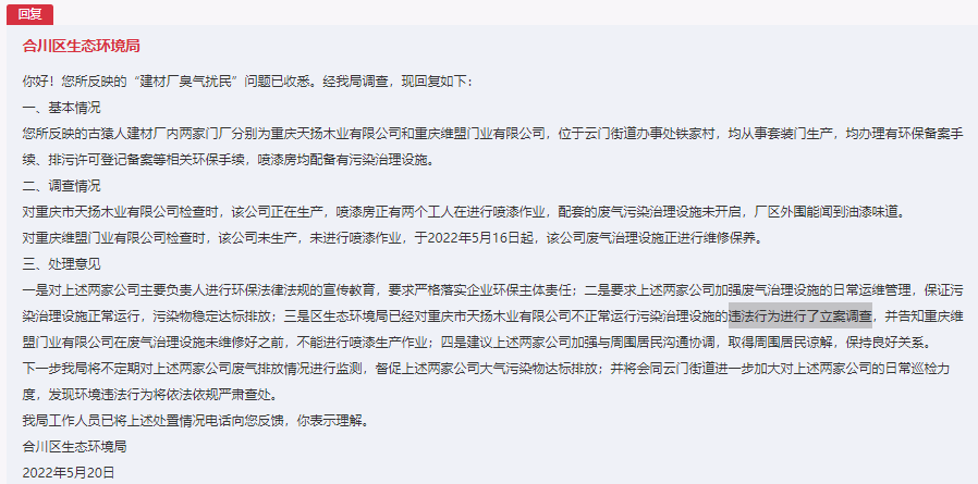 合川區(qū)生態(tài)環(huán)境局在回復(fù)中表示,已對兩家公司主要負(fù)責(zé)人進(jìn)行了環(huán)保法律法規(guī)的宣傳教育,要求嚴(yán)格落實(shí)企業(yè)環(huán)保主體責(zé)任;加強(qiáng)廢氣治理設(shè)施的日常運(yùn)維管理,保證污染治理設(shè)施正常運(yùn)行,污染物穩(wěn)定達(dá)標(biāo)排放。