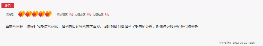 “謝謝各級領(lǐng)導(dǎo)的關(guān)心和關(guān)愛,我反映的廢氣排放問題已得到妥善處理。”針對合川區(qū)生態(tài)環(huán)境局的回復(fù)及處理,留言群眾也通過人民網(wǎng)“領(lǐng)導(dǎo)留言板”給出了五“心”好評,即解決程度、辦理態(tài)度、辦理速度均為最高分5分。