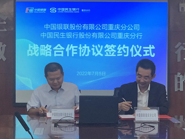 7月5日,中國民生銀行重慶分行與中國銀聯(lián)重慶分公司舉行戰(zhàn)略合作協(xié)議簽約儀式。
