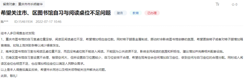 人民網(wǎng)重慶7月31日電 (陳琦)“重慶市部分圖書(shū)館閱讀區(qū)桌位不足,影響全民閱讀的氛圍和積極性,建議增加并完善相關(guān)配套設(shè)施?!?近日,有網(wǎng)友在人民網(wǎng)領(lǐng)導(dǎo)留言板給重慶市市長(zhǎng)胡衡華留言反映。對(duì)此,重慶市文旅委高度重視,要求全市各公共圖書(shū)館進(jìn)行舉一反三的自查,切實(shí)提高讀者滿意度。