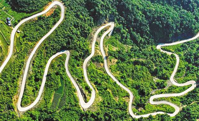 7月25日,無(wú)人機(jī)拍攝的酉陽(yáng)車(chē)田鄉(xiāng)盤(pán)山公路。特約攝影 陳碧生/視覺(jué)重慶