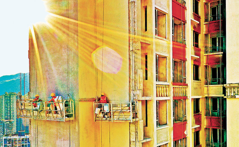 8月11日傍晚,萬(wàn)盛經(jīng)開(kāi)區(qū)一項(xiàng)目現(xiàn)場(chǎng),工人在落日的映照下進(jìn)行外墻施工。