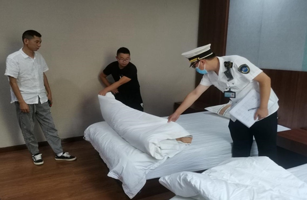 執(zhí)法人員檢查某旅店布草清洗消毒情況。石柱縣衛(wèi)生健康綜合行政執(zhí)法支隊供圖