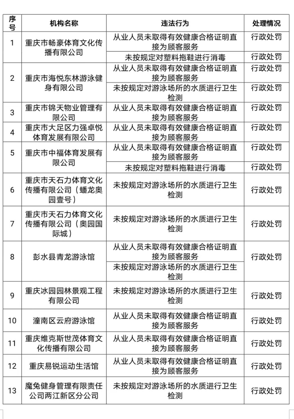 接下來,相關(guān)區(qū)縣衛(wèi)生和體育部門將及時跟進32家存在問題的游泳場所整改落實情況,確保相關(guān)問題得到整改解決,并對重慶市海悅東林游泳健身有限公司、重慶市暢豪體育文化傳播有限公司、重慶維克斯世茂體育文化傳播有限公司、重慶易銳運動生活館等13家存在違法違規(guī)行為的游泳場所進行行政處罰,切實讓群眾安“夏”心、“游”放心。