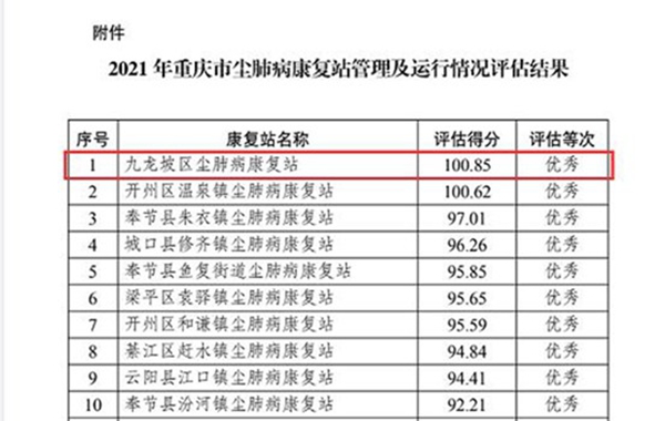 近日,在《重慶市衛(wèi)生健康委員會辦公室關(guān)于2021年重慶市塵肺病康復(fù)站管理及運行情況評估結(jié)果的通報》中,由重慶西區(qū)醫(yī)院、九龍坡區(qū)第二人民醫(yī)院運行的九龍坡區(qū)塵肺病康復(fù)站以100.85的高分獲第一名,評估等級為優(yōu)秀。