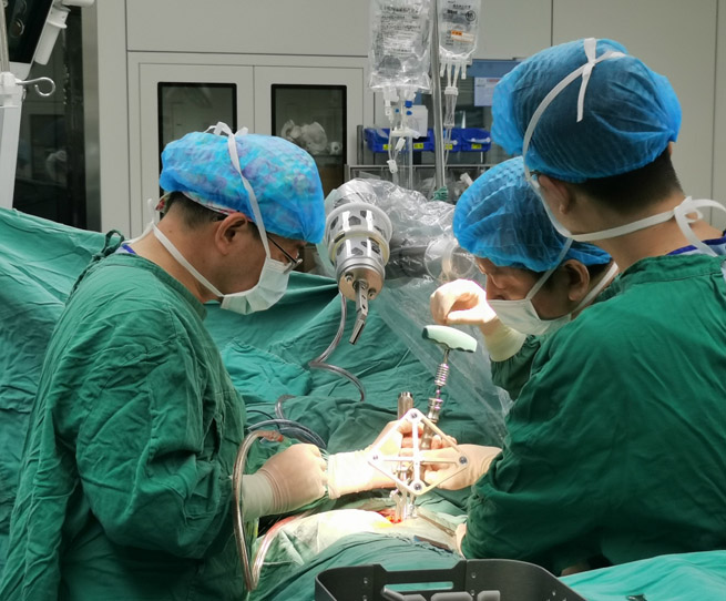 “該患兒的病變位置靠近頸椎,處于上胸段,臨近重要臟器多,常規(guī)手術(shù)難度較大?!眲⑿侵魅谓榻B,此次骨科團隊為夢夢定制了不同以往的新型手術(shù)方案,利用一臺先進的手術(shù)機器人作為“導航儀”,輔助醫(yī)生精準定位,完成置釘操作,最大限度保證釘?shù)馈安黄灰小?。機器人不僅協(xié)助醫(yī)生選擇最準確、安全的置釘位置,醫(yī)生還可將置釘?shù)尼樀老薅ㄔ谶x定的范圍內(nèi)。這樣既縮短手術(shù)時間,也大大增加手術(shù)精準度和安全性,減少術(shù)后并發(fā)癥。