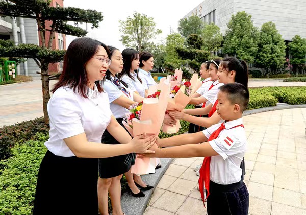 永川五洲小學(xué)學(xué)生向今年受區(qū)教委表彰的教師獻(xiàn)花。永川區(qū)教委供圖