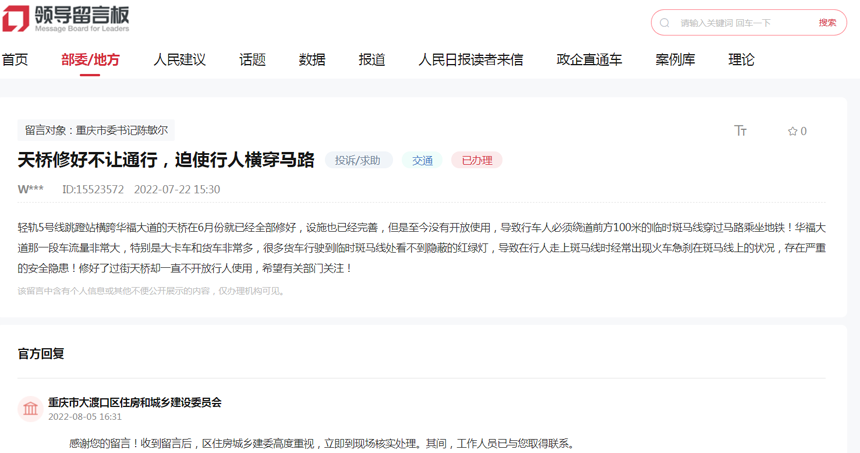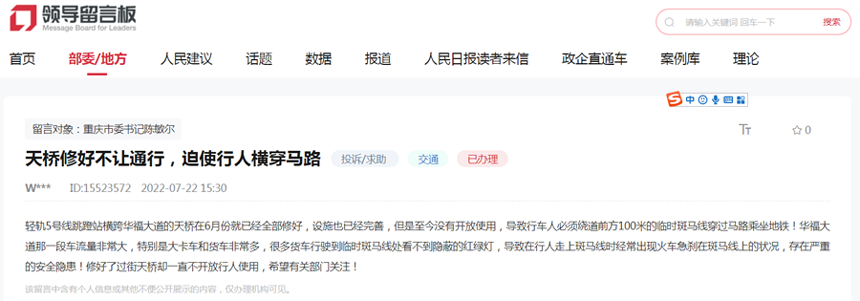 原來,2022年7月22日,該網(wǎng)友通過“領導留言板”向重慶市委書記陳敏爾反映,位于大渡口區(qū)輕軌5號線跳蹬站橫跨華福大道的天橋在6月份就已經(jīng)全部修好,設施也已經(jīng)完善,但至今沒有開放使用,導致行人必須繞道前方100米的臨時斑馬線穿過馬路乘坐地鐵。