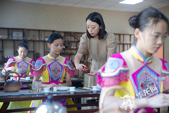 黔江民族職業(yè)教育中心,孩子們身著民族服裝學(xué)習(xí)茶藝。華龍網(wǎng)-新重慶客戶端記者 張質(zhì) 攝