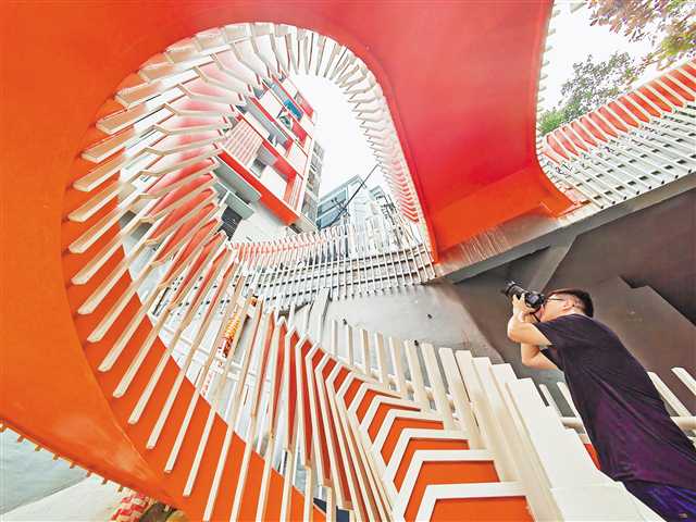 9月17日,南岸區(qū)龍門浩街道龍門路,市民正在旋轉(zhuǎn)樓梯拍照留影。