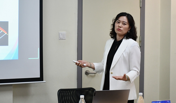 闞秋霞開展《數(shù)字化角膜塑形鏡驗配》專題演講。重慶普瑞眼科醫(yī)院供圖