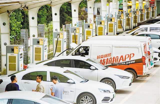 渝北區(qū)三亞灣水產(chǎn)交易市場旁的星星充電站,不少車輛在此充電。在運營車輛充電高峰期,該充電站70個充電車位幾乎“滿員”。(攝于7月3日)記者 張錦輝 攝/視覺重慶