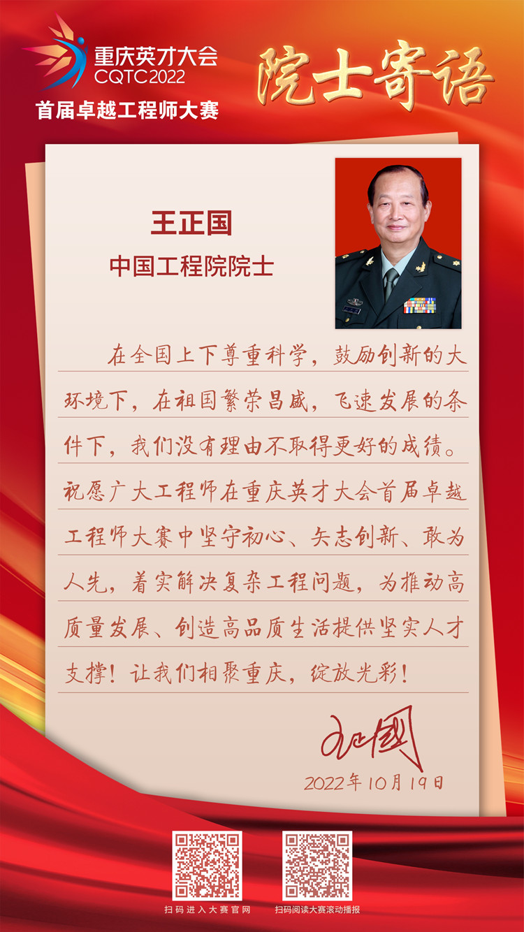 10月19日,中國(guó)工程院院士王正國(guó)向2022重慶英才大會(huì)首屆卓越工程師大賽發(fā)來(lái)寄語(yǔ):在全國(guó)上下尊重科學(xué),鼓勵(lì)創(chuàng)新的大環(huán)境下,在祖國(guó)繁榮昌盛,飛速發(fā)展的條件下,我們沒(méi)有理由不取得更好的成績(jī)。祝愿廣大工程師在重慶英才大會(huì)首屆卓越工程師大賽中堅(jiān)守初心、矢志創(chuàng)新、敢為人先,著實(shí)解決復(fù)雜工程問(wèn)題,為推動(dòng)高質(zhì)量發(fā)展、創(chuàng)造高品質(zhì)生活提供堅(jiān)實(shí)人才支撐!讓我們相聚重慶,綻放光彩!