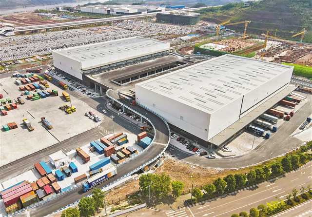 位于果園港國(guó)家物流樞紐的中新(重慶)多式聯(lián)運(yùn)示范基地,一期項(xiàng)目集拼倉(cāng)庫(kù)和集裝箱堆場(chǎng)一片繁忙。(攝于2022年4月27日)記者 張錦輝 攝/視覺(jué)重慶