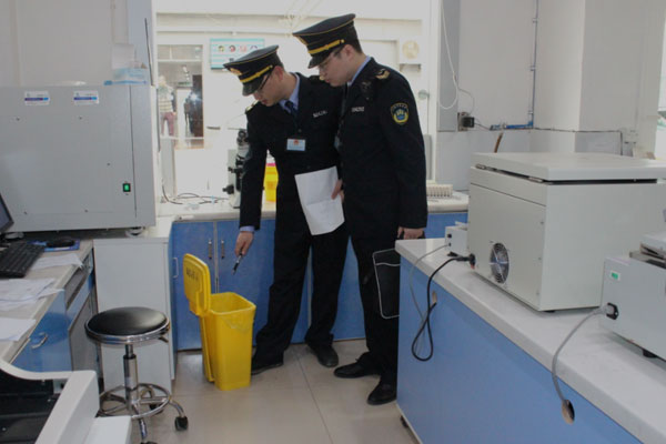 衛(wèi)生監(jiān)督員對(duì)醫(yī)療廢物進(jìn)行檢查。江津區(qū)衛(wèi)生健康綜合行政執(zhí)法支隊(duì)供圖