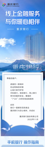 回歸初心,不忘始終。重慶銀行將始終堅(jiān)持“心相伴,共成長”的客戶服務(wù)理念,堅(jiān)決扛起疫情防控的社會責(zé)任,持續(xù)優(yōu)化線上服務(wù)渠道,增強(qiáng)客戶線上金融服務(wù)體驗(yàn),全力確保金融服務(wù)“不斷檔”,為廣大人民群眾提供更便捷、更貼心、更優(yōu)質(zhì)的金融服務(wù)。