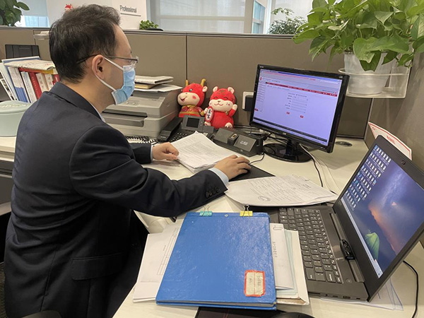 重慶農(nóng)商行總行國際業(yè)務(wù)部業(yè)務(wù)骨干值守在單位及時處理業(yè)務(wù)需求。重慶農(nóng)商行供圖