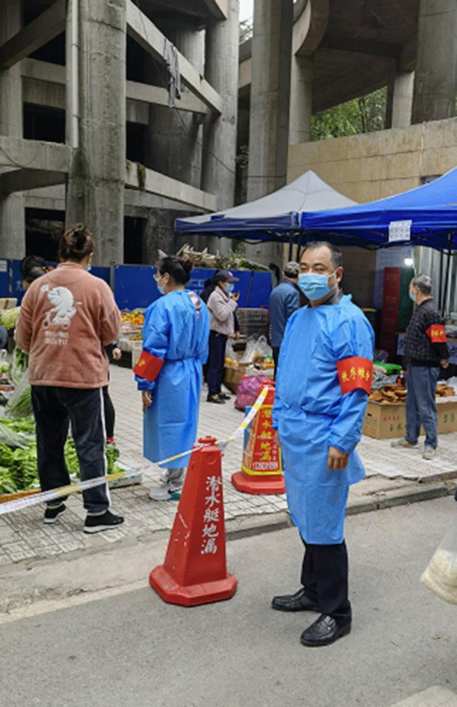 菜市場(chǎng)經(jīng)營(yíng)戶眾多、流動(dòng)人口密集,是抗疫中容易發(fā)生交叉感染的區(qū)域,陳明祥主動(dòng)請(qǐng)戰(zhàn),全程參與菜市場(chǎng)防疫志愿服務(wù),連續(xù)多日開展協(xié)助值勤值守、維持排隊(duì)秩序、居民出入登記排查等工作。